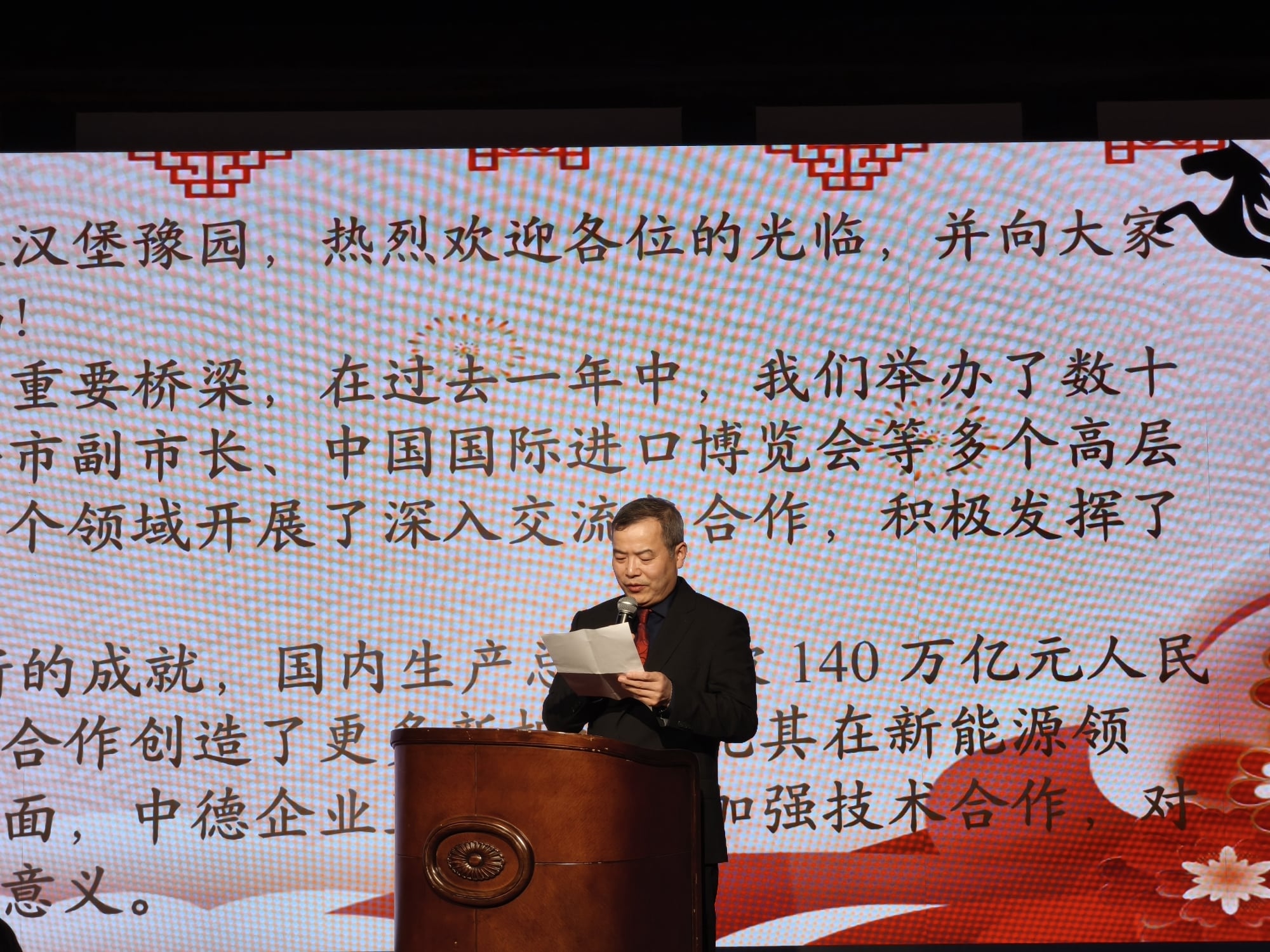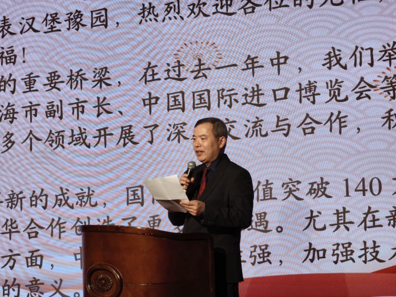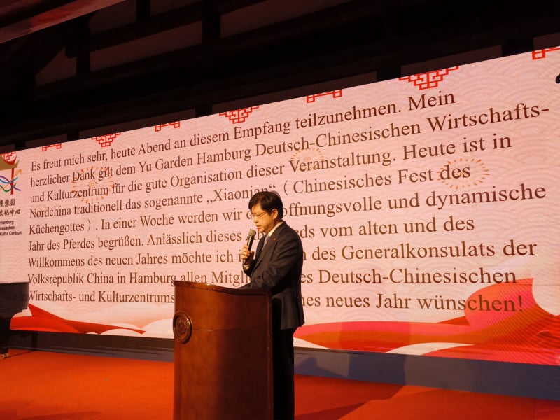Als Ehrengast begrüßte anschließend der chinesische Generalkonsul Lin Dong die Gäste. Lin bedankte sich herzlich beim Yu Garten Hamburg Deutsch-Chinesisches Wirtschafts- und Kulturzentrum, wie sich das Zentrum mit seinem vollem Namen nennt, für die hervorragende Organisation des Frühlingsfest-Empfangs. Auch der Generalkonsul wies darauf hin, dass sich die Welt in unruhigen Zeiten befindet und hofft auf die Kraft des Feuerpferdes, um Unitarismus, Protektionismus, Machtpolitik und Wachstumsschwäche gemeinsam zu überwinden. „China hat auch im vergangenen Jahr ein beindruckendes Wachstum verzeichnet. Davon kann die ganze Welt profitieren. China kann der Welt wertvolle Stabilität und Planungssicherheit geben“, sagte Generalkonsul Lin.