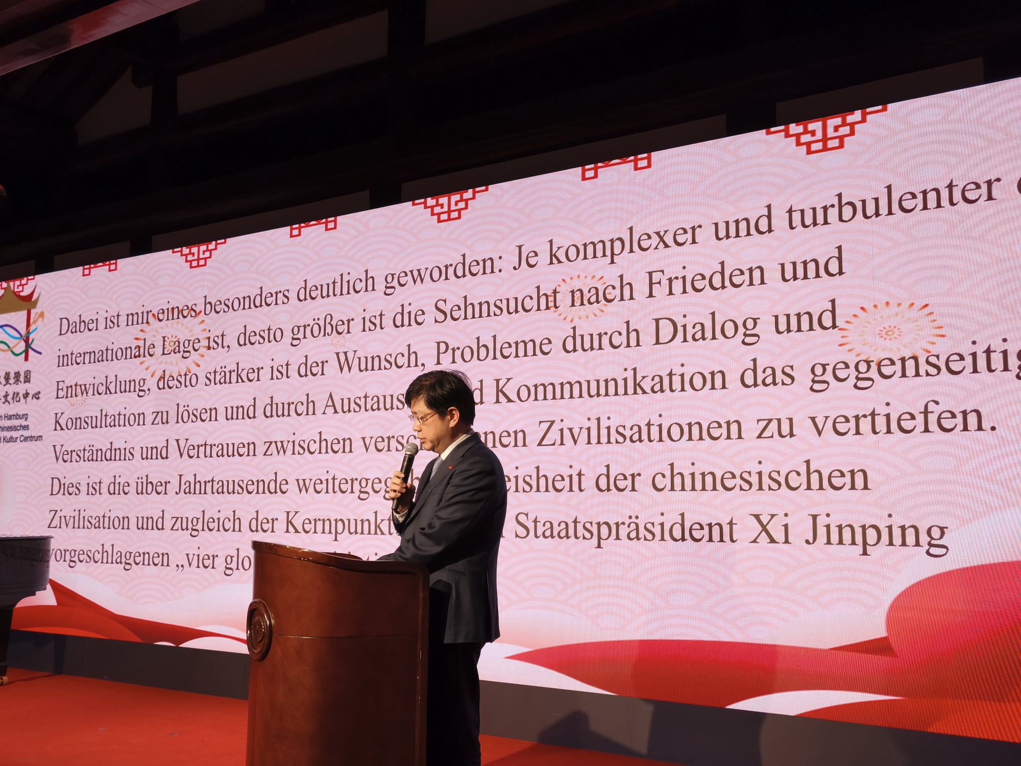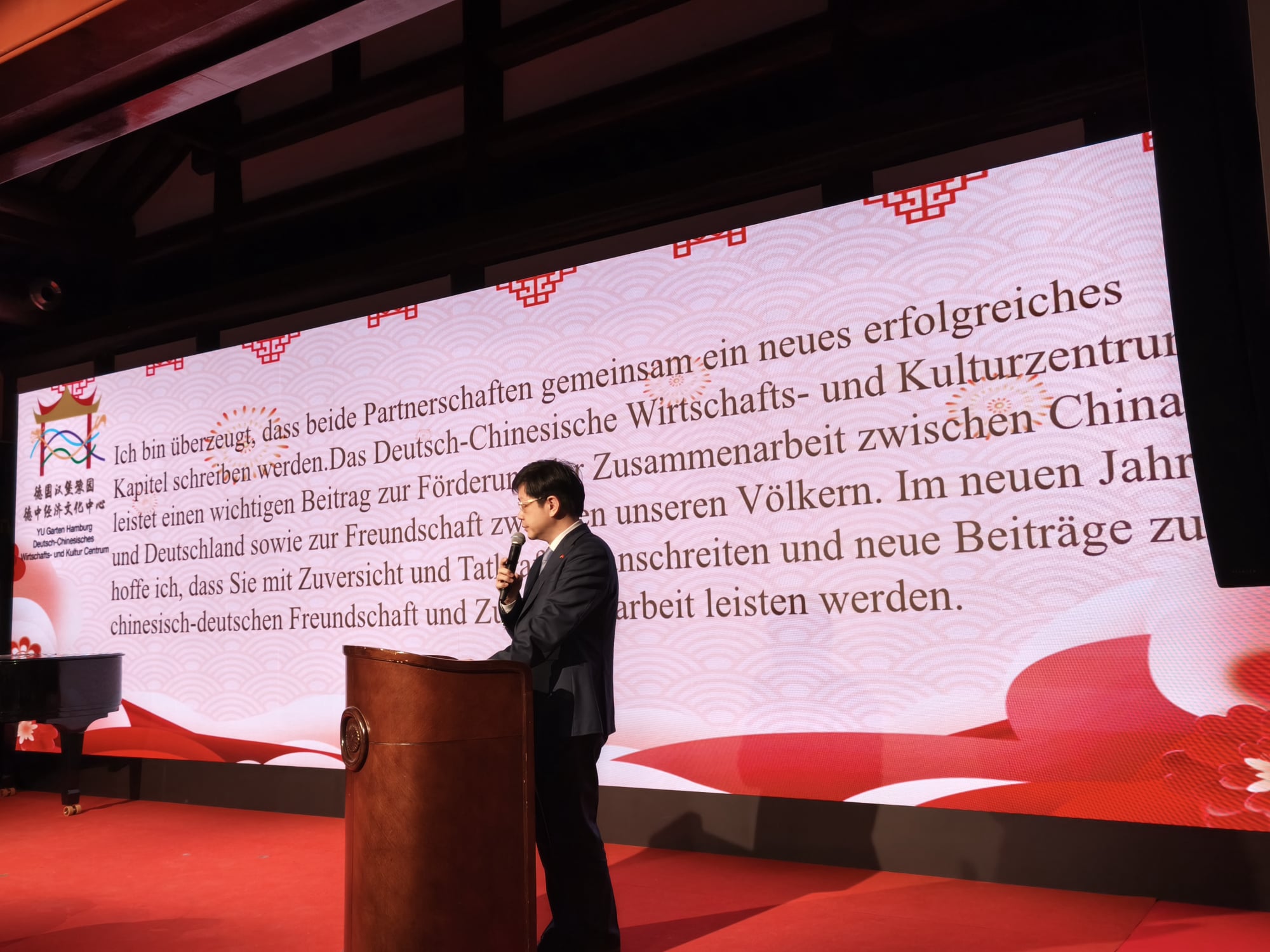 Nach der kurzen Einführung begrüßte der Gastgeber des Abends, Wolfgang Wen, Geschäftsführer des Yu Gartens, die Gäste. Wen kann stolz auf das zurückliegende Jahr blicken und ist zuversichtlich für die Zukunft. „Als wichtige Brücke der Wirtschaftsbeziehungen, des wissenschaftlichen und Kulturaustausch zwischen China und Deutschland hat der Yu Garten im vergangenen Jahr viel zum grundsätzlichen Verständnis beigetragen und zahlreiche und hochrangige Delegationen empfangen. Wir konnten schon den Bürgermeister von Shanghai und viele bekannte Vertreter aus vielen Bereichen hier begrüßen. Persönlichkeiten aus recht unterschiedlichen Bereichen wie Wissenschaft oder Kultur tragen bei uns zu einem intensive Austauschen bei, machen den Yu Garten zu einer Brücke in Hamburg für den deutsch-chinesischen Austausch und bieten den Ort für eine gute Zusammenarbeit. Der Yu Garten ist ein Ort der direkten menschlichen Begegnung,“ sagte Wen.