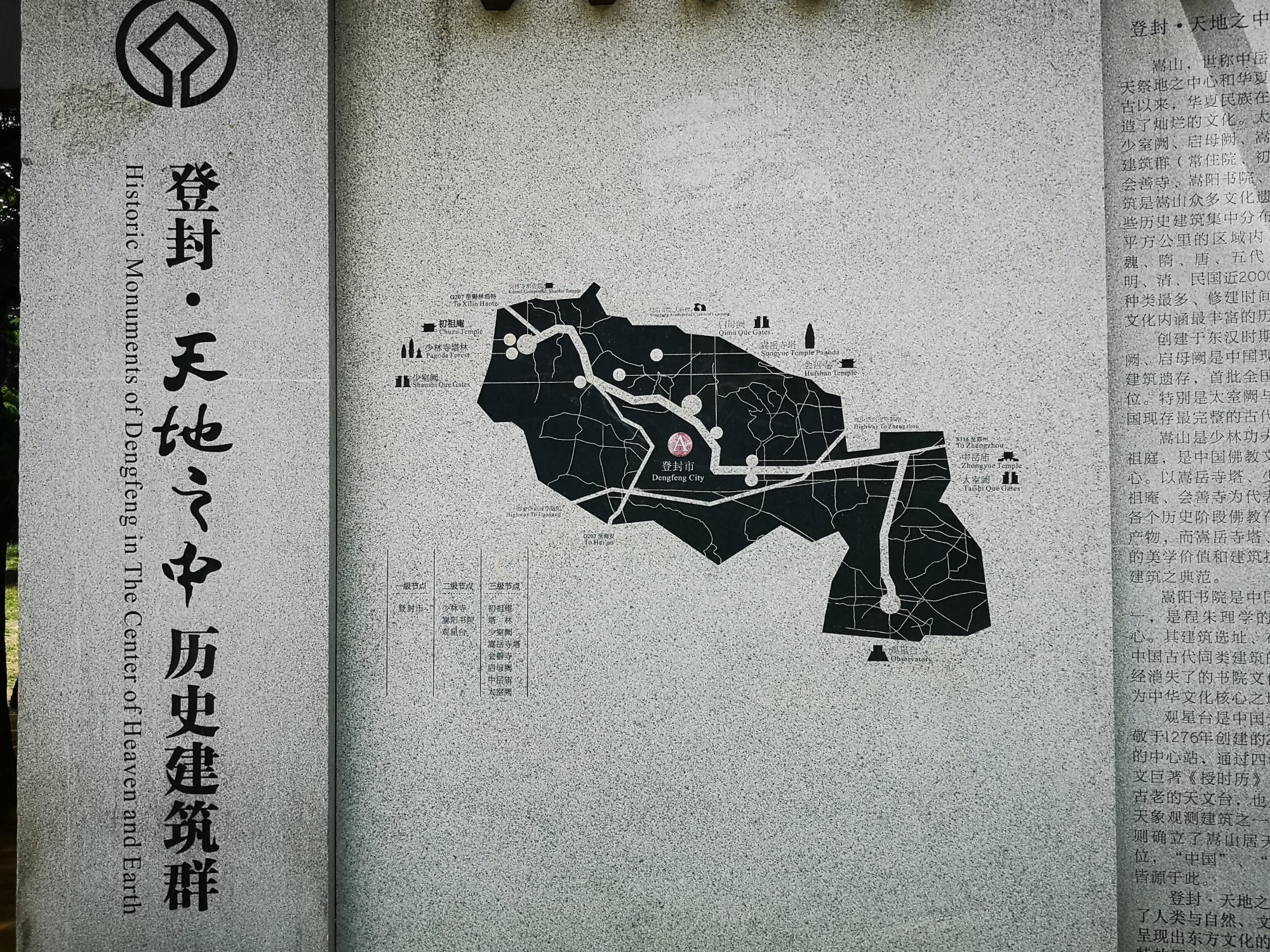 Der Songshan Berg liegt im Nordwesten der Stadt Dengfeng und gilt als höchster und zentraler Berg unter den fünf heiligen Bergen Chinas. Er erstreckt sich über mehr als 60 km von Ost nach West. Songshan ist ein Geopark der UNESCO.